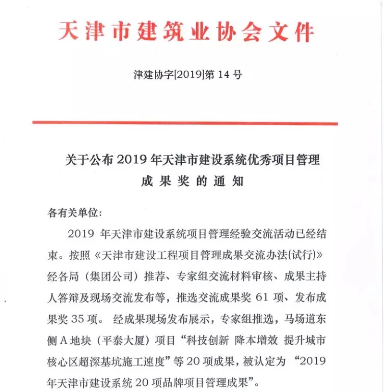 4月23日,公司選送的《發(fā)揮科技引領(lǐng) 激發(fā)綠色動能 打造民航機(jī)場領(lǐng)域施工品牌》管理成果,被天津市建筑業(yè)協(xié)會評為“2019年天津市建設(shè)系統(tǒng)20項(xiàng)品牌項(xiàng)目管理成果”。