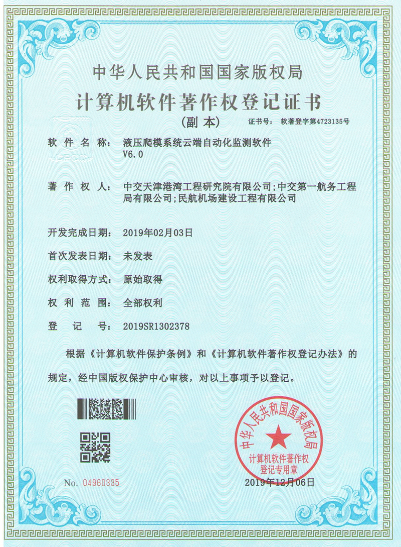 近日,由公司參與研發(fā)的“液壓爬模系統(tǒng)云端自動(dòng)化檢測(cè)軟件V6.0”順利通過中國版權(quán)保護(hù)中心審核,獲得由國家版權(quán)局頒發(fā)的《計(jì)算機(jī)軟件著作權(quán)登記證書》。