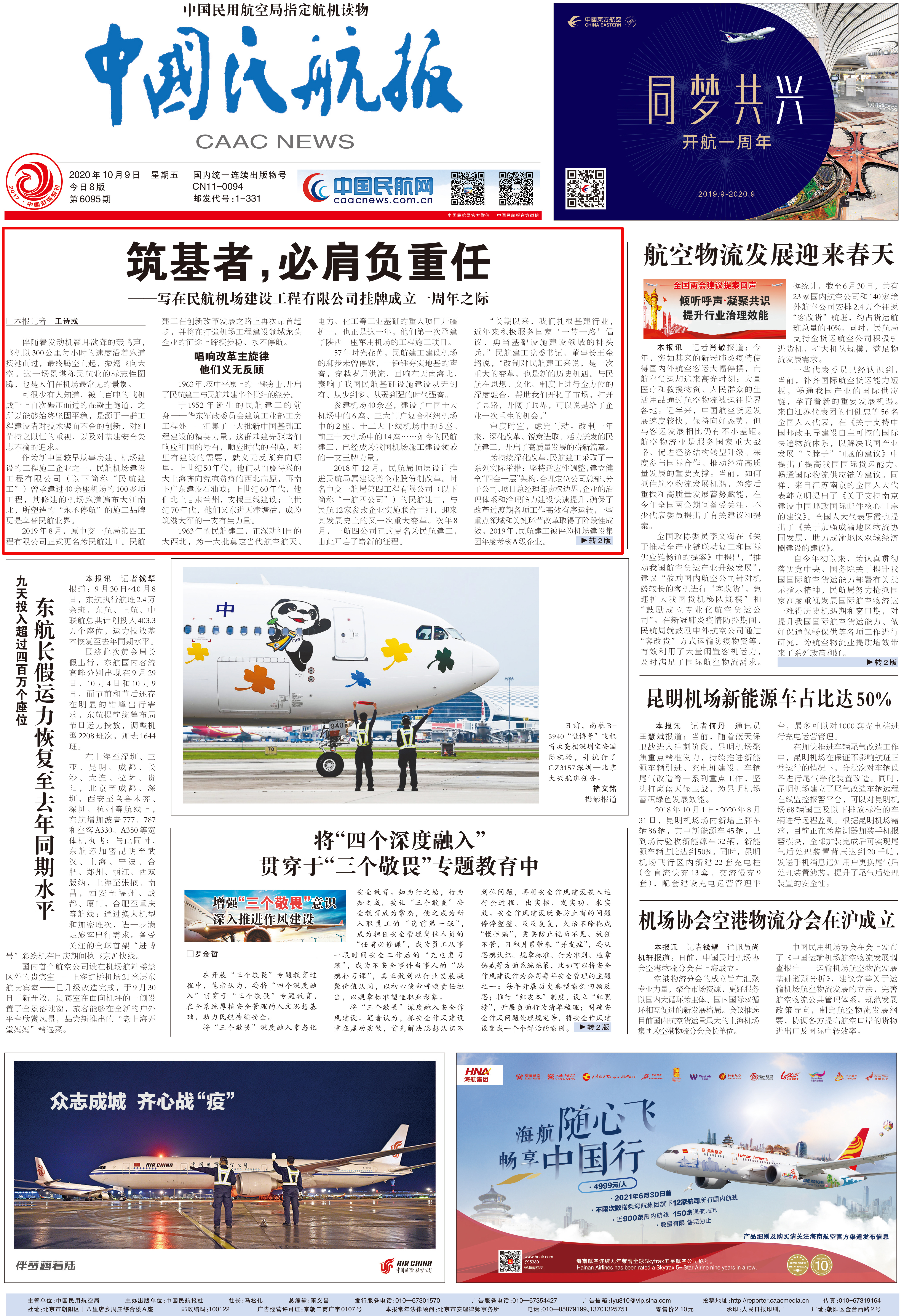 10月9日,《中國民航報》第6095期刊發(fā)頭版頭條文章,以《筑基者,必肩負重任——寫在民航機場建設(shè)工程有限公司掛牌成立一周年之際》為題,對公司改革發(fā)展歷程及取得的成就業(yè)績等內(nèi)容進行深度報道。