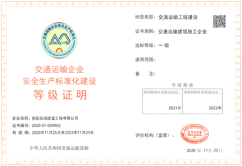 交通運(yùn)輸企業(yè)安全生產(chǎn)標(biāo)準(zhǔn)化一級企業(yè)考評是交通運(yùn)輸部為大力推進(jìn)企業(yè)安全生產(chǎn)標(biāo)準(zhǔn)化建設(shè)而設(shè)立,考評內(nèi)容包括目標(biāo)與考核、管理人員和機(jī)構(gòu)、安全責(zé)任體系、風(fēng)險(xiǎn)管理、安全生產(chǎn)管理制度等方面,經(jīng)過評審和公示等流程,評選出近年來安全生產(chǎn)管理工作表現(xiàn)突出的建筑企業(yè),有效期3年。