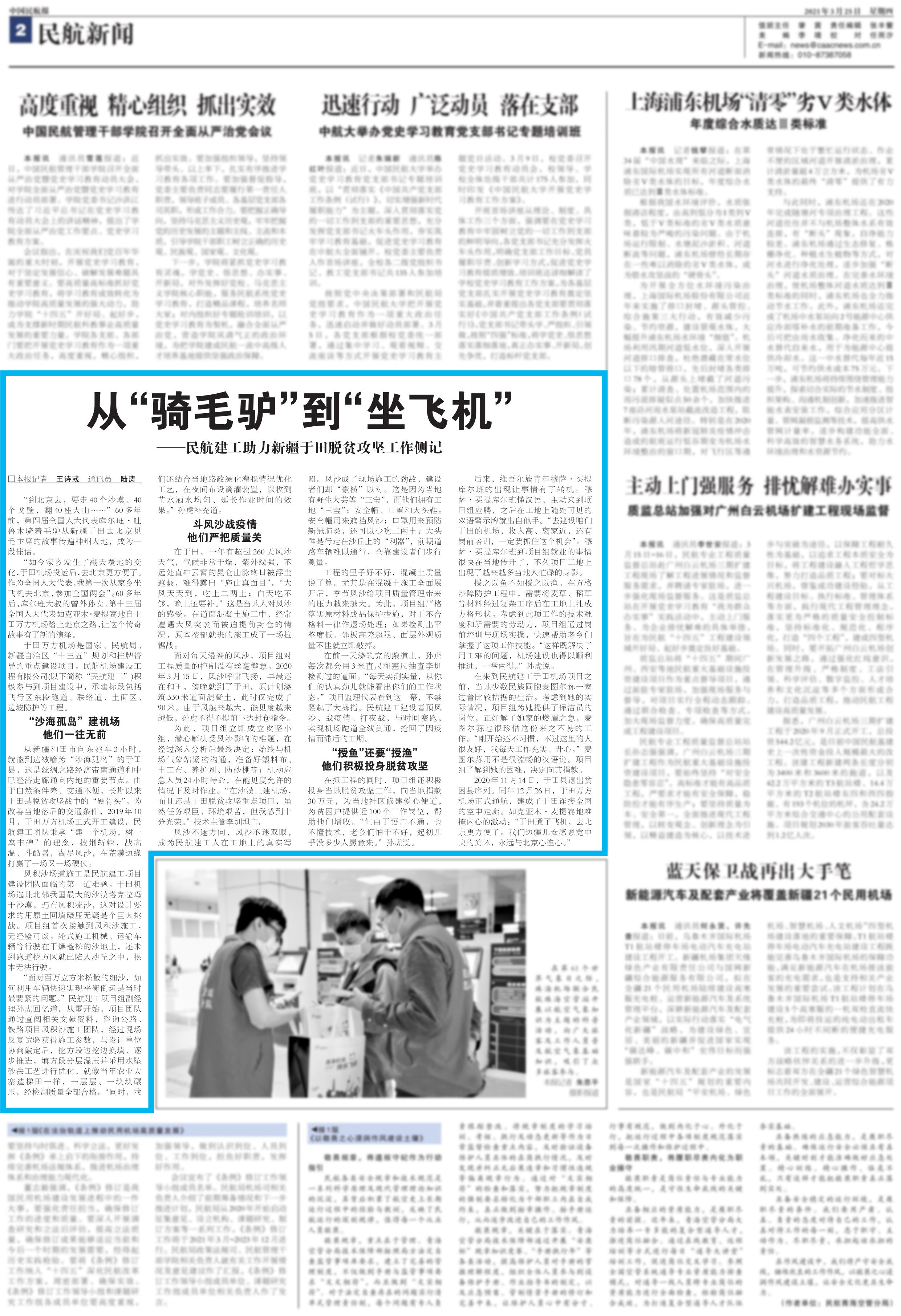 3月25日,《中國民航報(bào)》第6186期二版以《從“騎毛驢”到“坐飛機(jī)”——民航建工助力新疆于田脫貧攻堅(jiān)側(cè)記》為題,對(duì)公司助力新疆于田萬方機(jī)場(chǎng)項(xiàng)目施工建設(shè),積極投身當(dāng)?shù)孛撠毠?jiān)工作,促進(jìn)當(dāng)?shù)亟?jīng)濟(jì)社會(huì)事業(yè)快速發(fā)展的事跡進(jìn)行了專題深度報(bào)道。