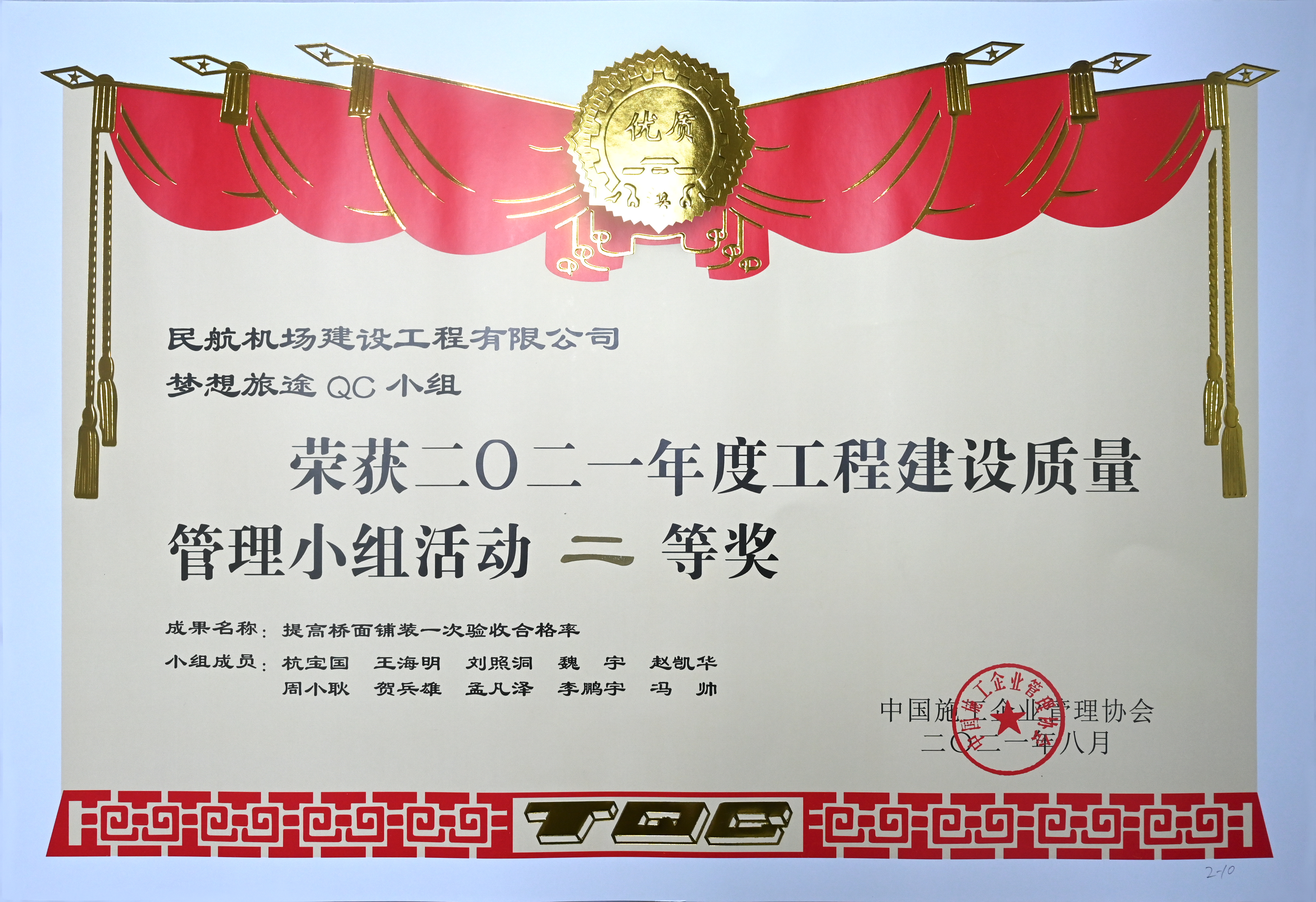 8月19日,中國施工企業(yè)管理協(xié)會(huì)2021年度全國工程建設(shè)質(zhì)量管理小組競(jìng)賽活動(dòng)結(jié)果公布,公司“夢(mèng)想旅途”QC小組的參賽成果《提高橋面鋪裝一次驗(yàn)收合格率》榮獲2021年度全國工程建設(shè)質(zhì)量管理小組活動(dòng)二等獎(jiǎng)。