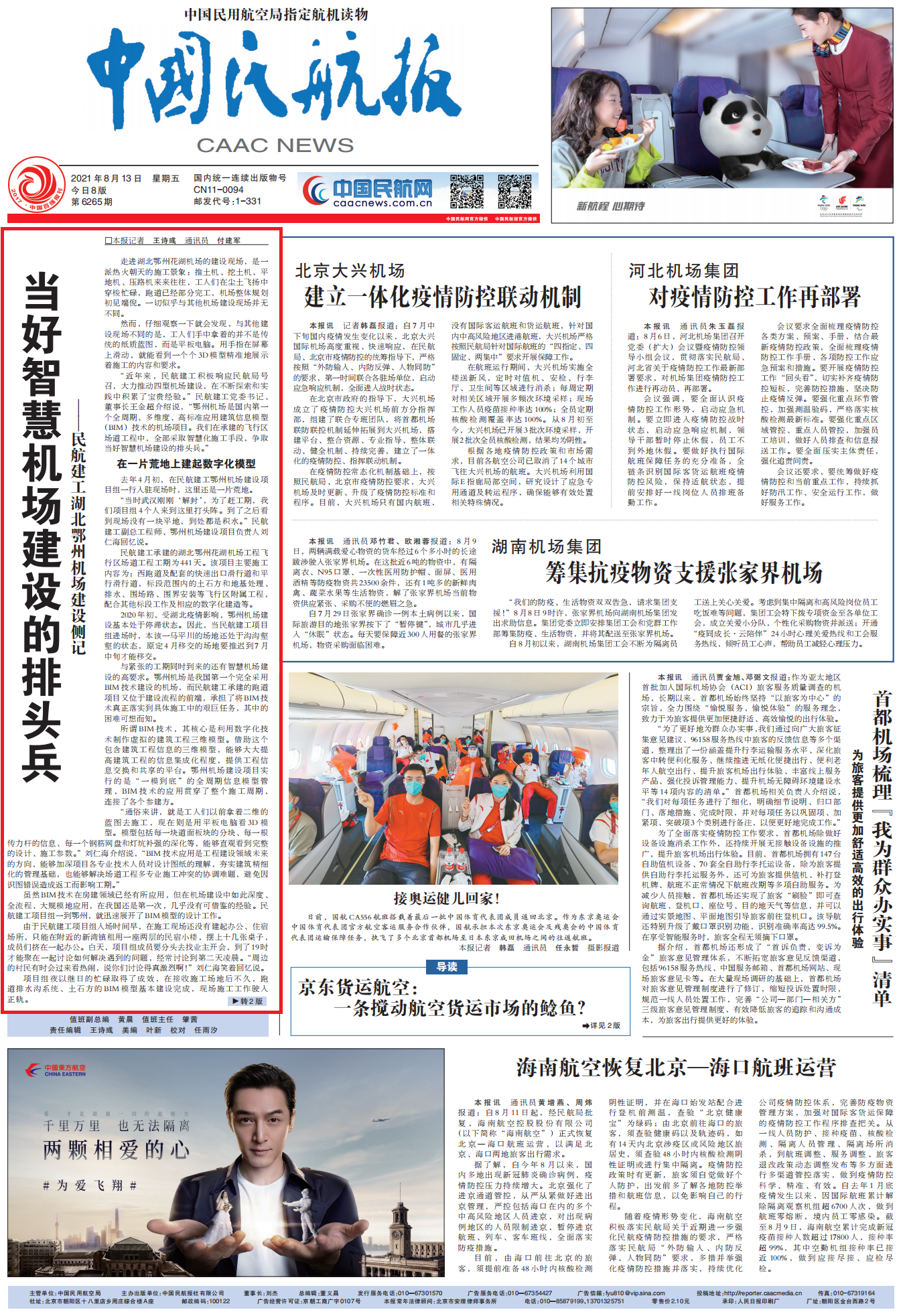 8月13日,《中國民航報(bào)》第6265期刊發(fā)頭版頭條文章,以《當(dāng)好智慧機(jī)場建設(shè)的排頭兵——民航建工湖北鄂州機(jī)場建設(shè)側(cè)記》為題,對公司第十一總經(jīng)理部承建的湖北鄂州花湖機(jī)場飛行區(qū)場道工程一標(biāo)段數(shù)字化施工與BIM應(yīng)用及項(xiàng)目整體建設(shè)情況等進(jìn)行了專題深度報(bào)道。
