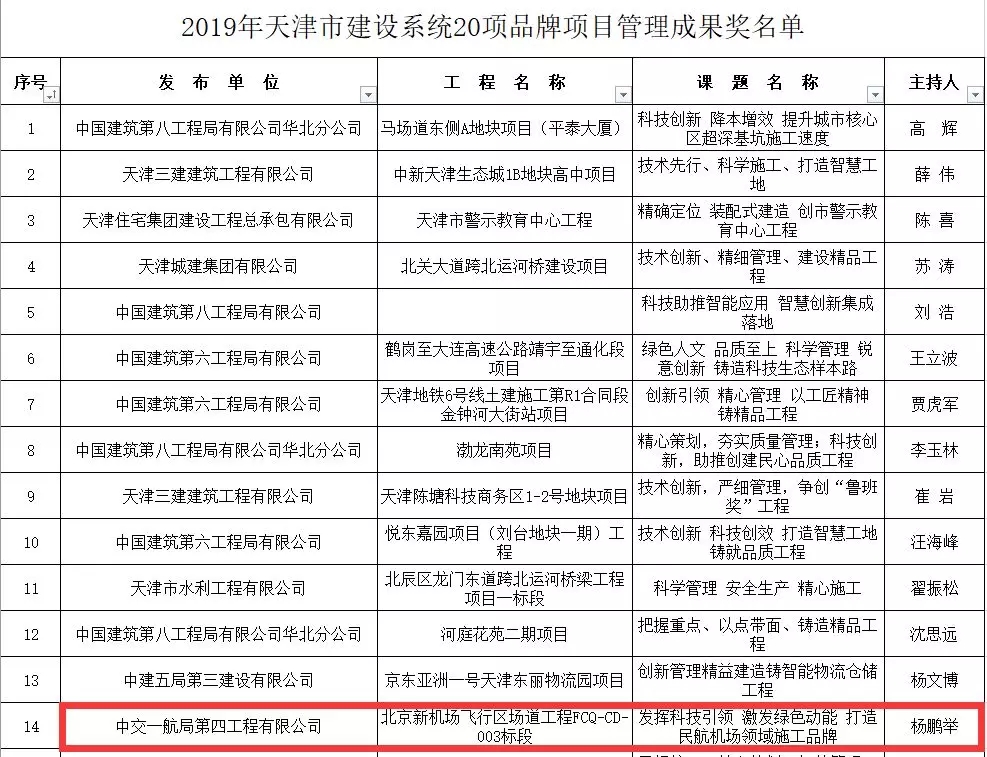 4月23日,公司選送的《發(fā)揮科技引領(lǐng) 激發(fā)綠色動(dòng)能 打造民航機(jī)場(chǎng)領(lǐng)域施工品牌》管理成果,被天津市建筑業(yè)協(xié)會(huì)評(píng)為“2019年天津市建設(shè)系統(tǒng)20項(xiàng)品牌項(xiàng)目管理成果”。