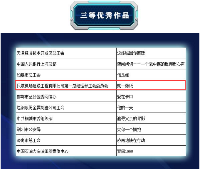 10月28日,從全國(guó)總工會(huì)官微獲悉,全國(guó)工會(huì)網(wǎng)絡(luò)正能量微視頻征集活動(dòng)評(píng)選結(jié)果揭曉,公司第一總經(jīng)理部攝制的微視頻《就一張紙》從1600余部作品中脫穎而出,喜獲“三等優(yōu)秀作品”獎(jiǎng)。